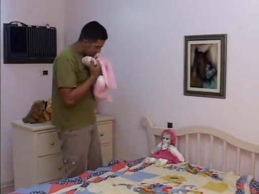 Молодой парень, который работал садовником случайно зашел в комнату к хозяйской дочери. Увидев игрушки, он стал их жмякать, как вдруг вошла девушка. Спрятавшись, он увидел, что брюнетка ласкает свою киску и случайно выдал себя. Далее он стал лизать ее груди и киску. Девушка с радостью отсосала его член, и ребята занялись чудесным сексом, проработав все дырочки. После нескольких минут активного перепихона, он кончил на ее смуглую попку.