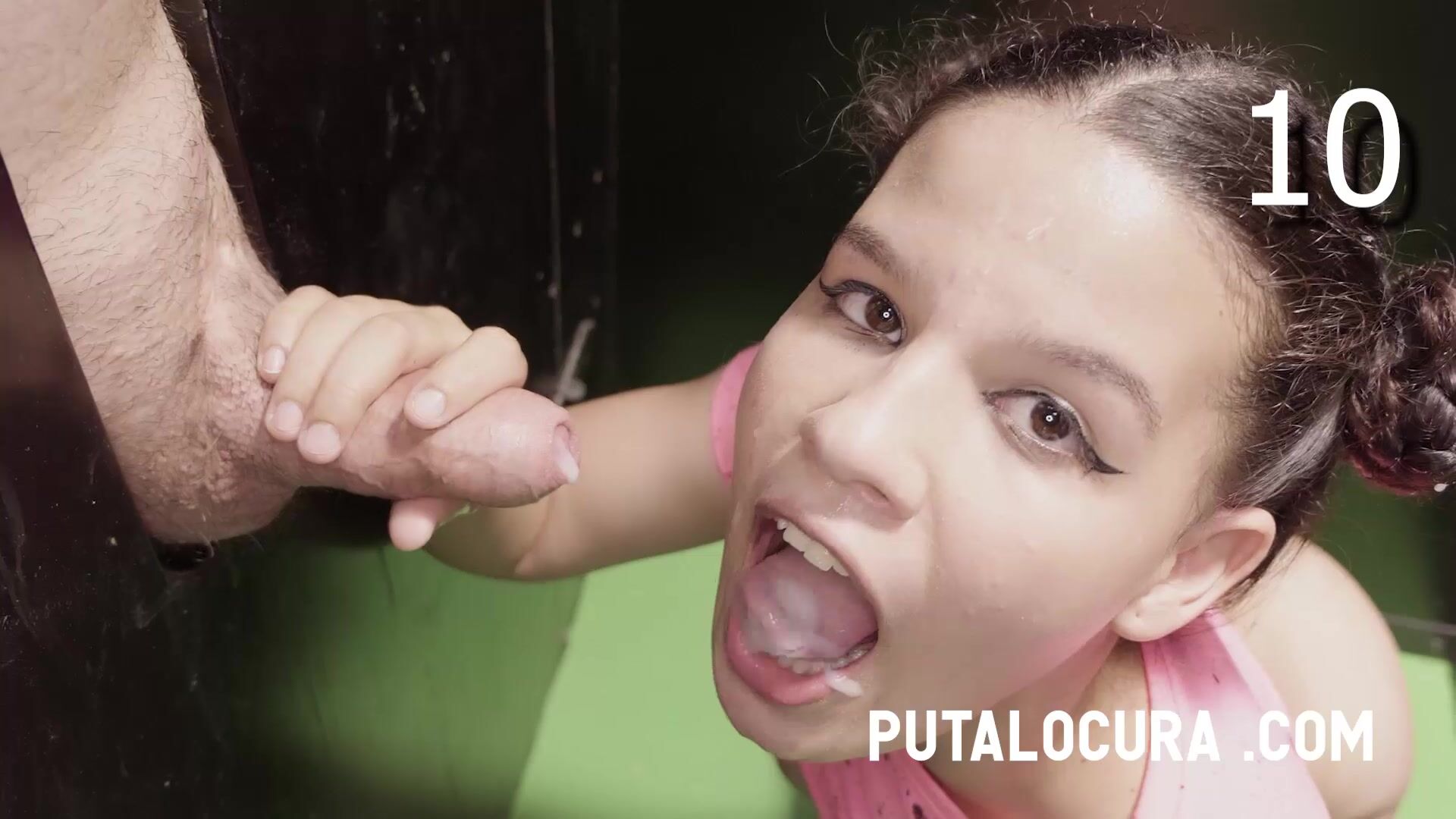 Кудрявая шлюшка дала снять с себя лишнюю одежду и взялась обслужить толпу мужиков по полной. Сучка сразу нагнулась и начала работать ртом, попутно давая драть себя во влагалище. После этого деваха перебралась в специальное помещение, где принялась сосать члены прямо через дырки в стенах, а в завершении угостилась спермой.